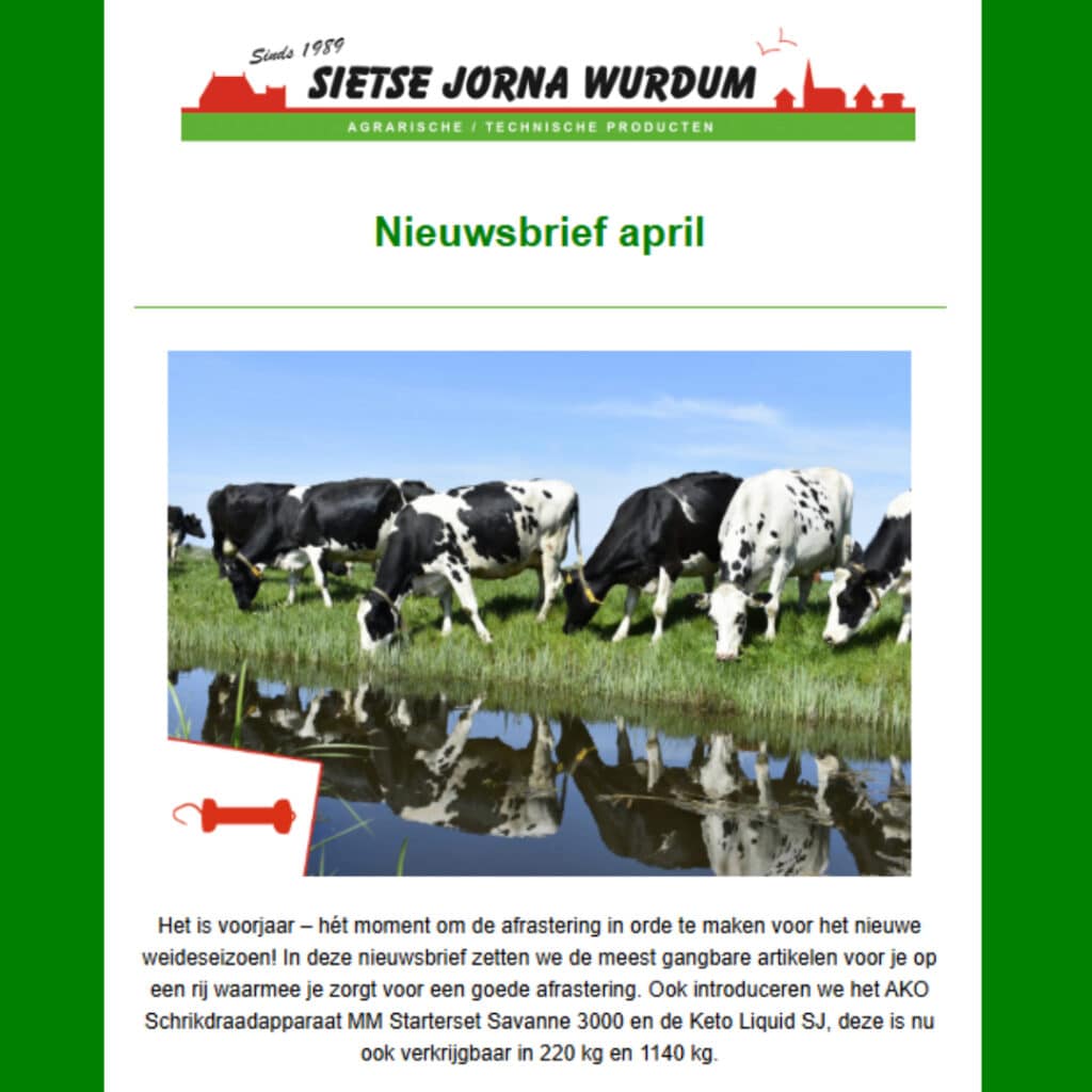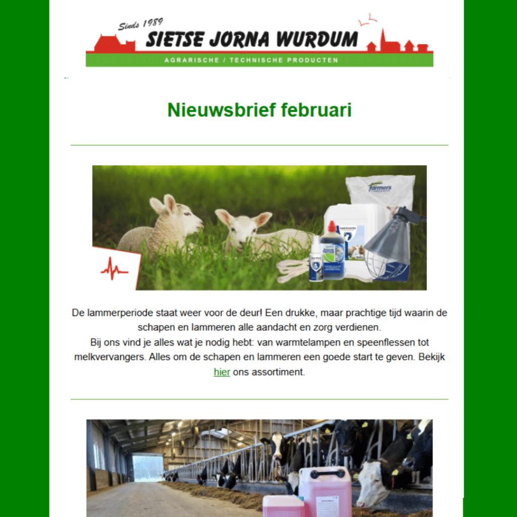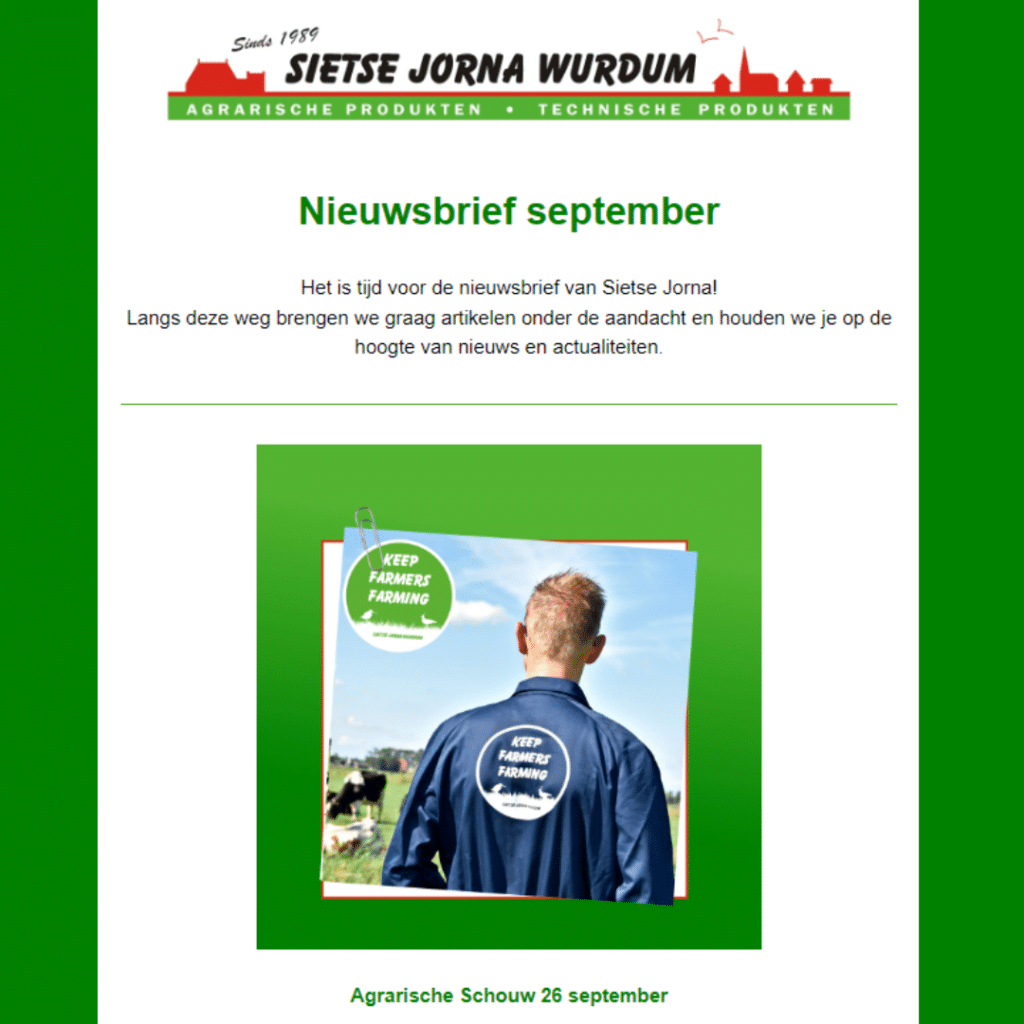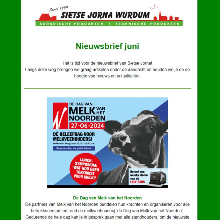 Nieuwsbrief Met de nieuwsbrief van Sietse Jorna brengen we graag artikelen onder de aandacht, zoals over het onderhoud van de veescheermachine en houden we je op de hoogte van nieuws en actualiteiten. Schrijf je in voor onze nieuwsbrief