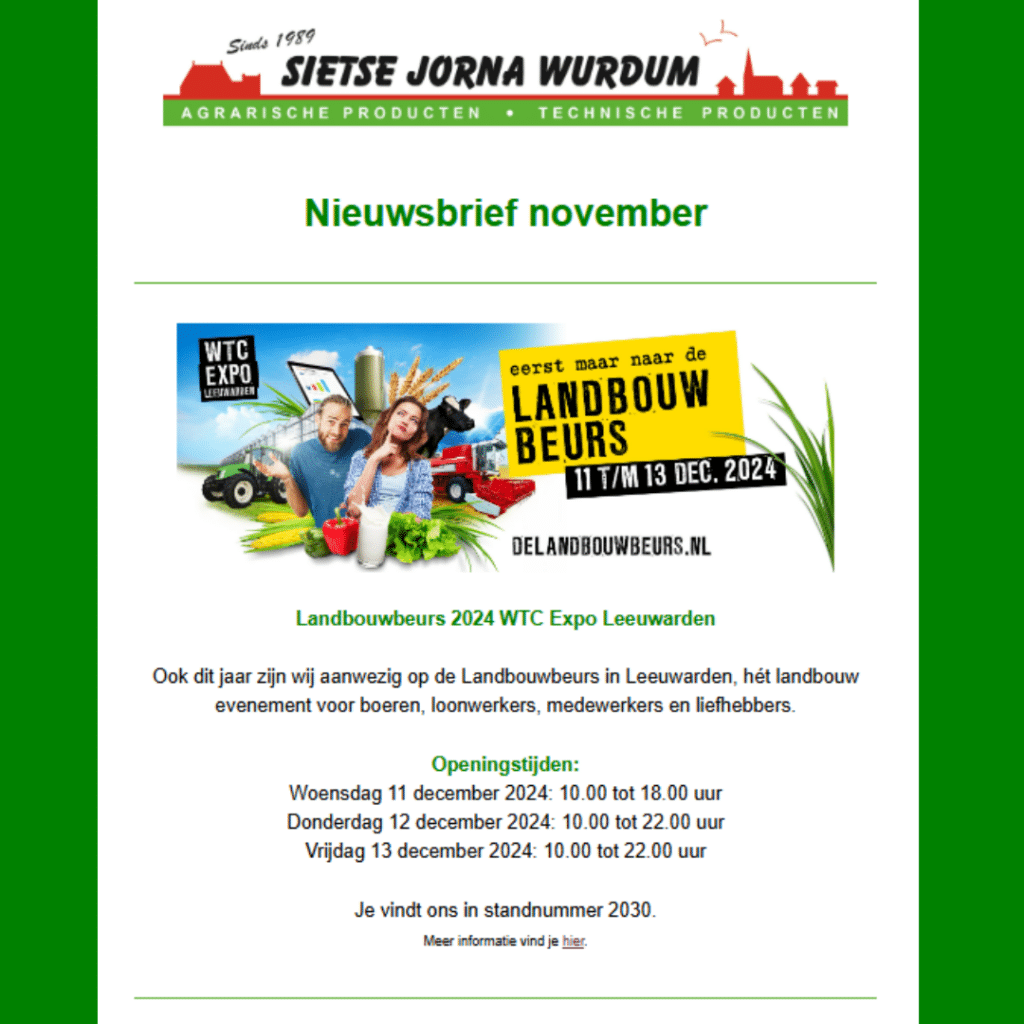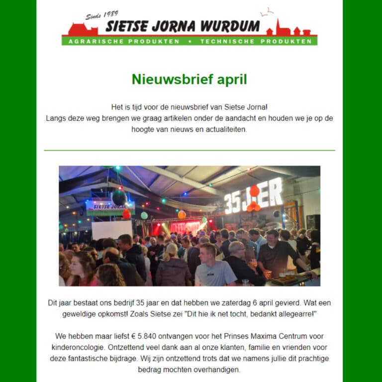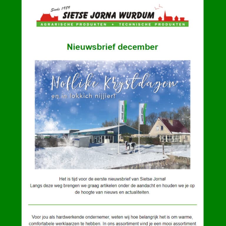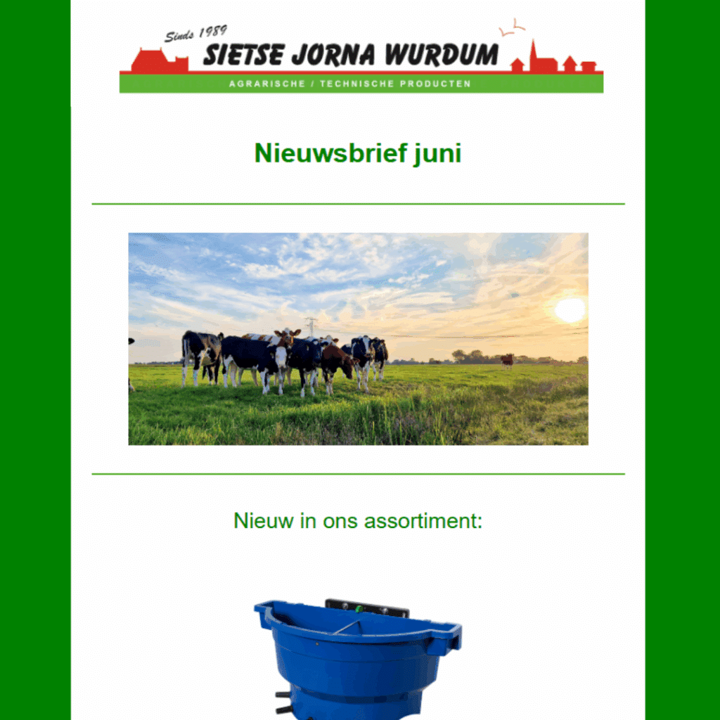 Nieuwsbrief Met de nieuwsbrief van Sietse Jorna brengen we graag artikelen onder de aandacht, zoals over het onderhoud van de veescheermachine en houden we je op de hoogte van nieuws en actualiteiten. Schrijf je in voor onze nieuwsbrief