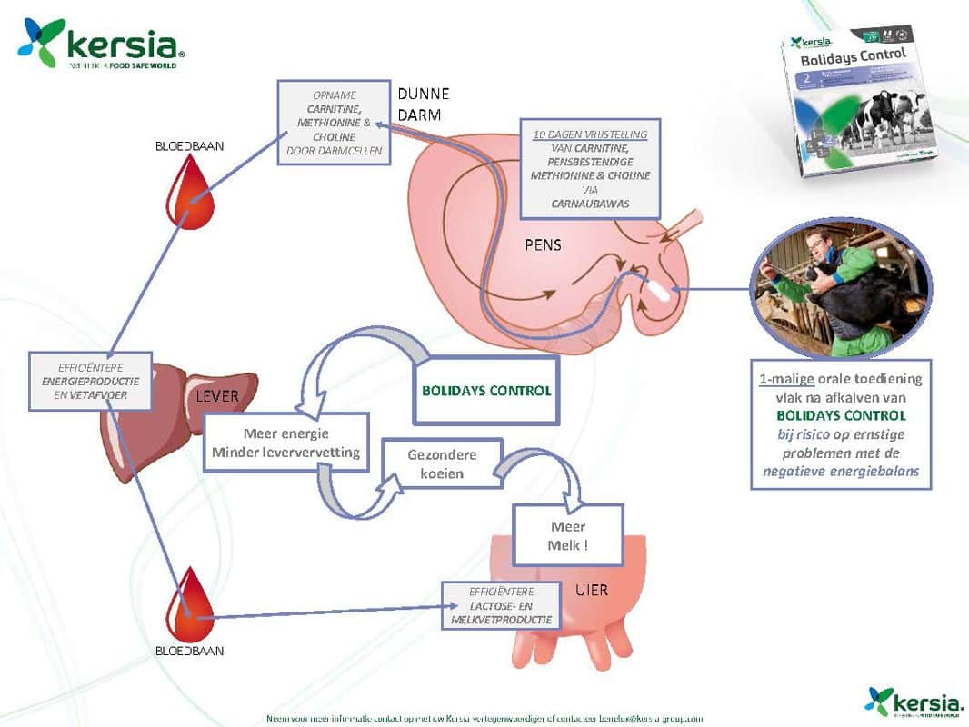 De Kersia Bolidays Control slow-release bolus levert gedurende 10 dagen een combinatie van L-carnitine, pensbestendige methionine en choline aan de koe. Deze voedingsstoffen ondersteunen de stofwisseling en helpen bij de afvoer van vetten uit de lever. Daarnaast bevordert de bolus de eetlust en biedt extra ondersteuning bij de melkproductie door de toevoeging van calcium. Hiermee bied je de koe de nodige ondersteuning bij slepende melkziekte.