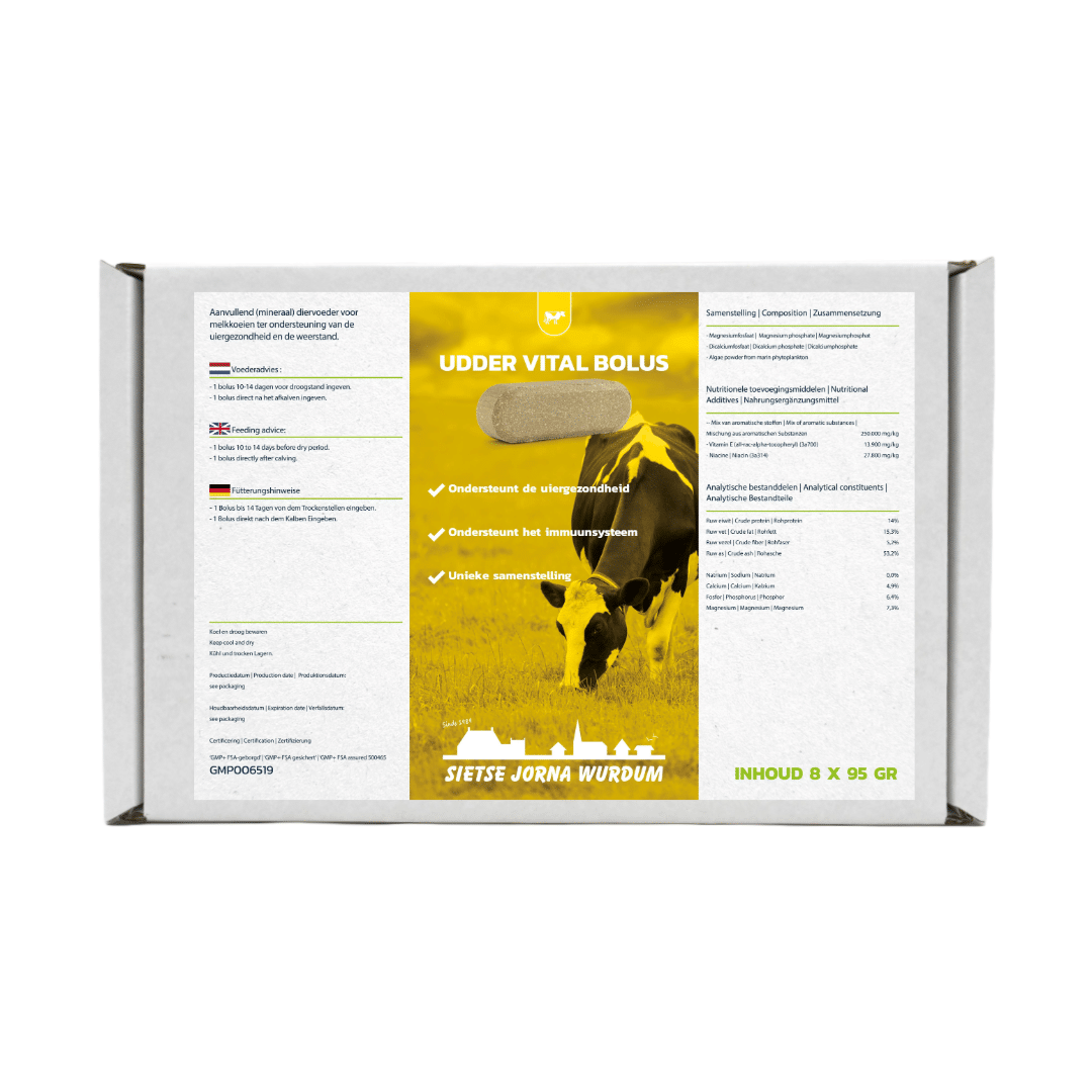 De Udder-Vital bolus SJ is een aanvullend diervoeder (mineraalvoeder) van Sietse Jorna, ter ondersteuning van de uiergezondheid en de algehele weerstand. De Udder Vital bolus is ontwikkeld voor een brede werking en inzetbaarheid, en helpt om het gebruik van antibiotica te verminderen.