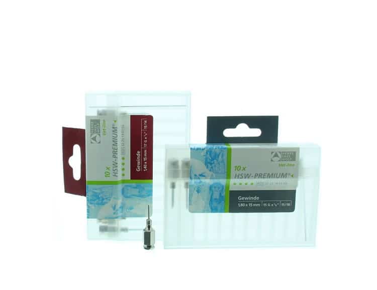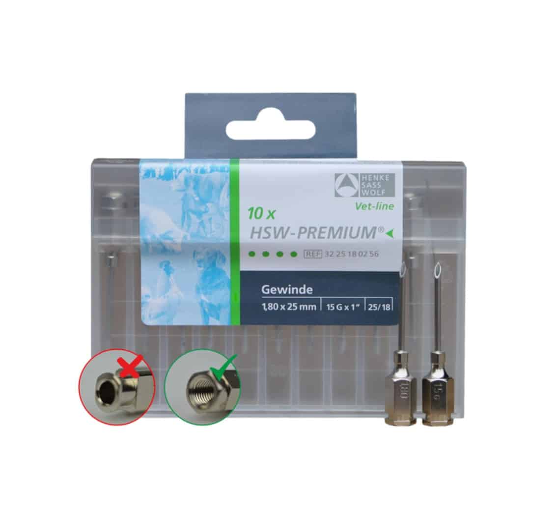 Henke metalen injectienaalden met schroefaansluiting. De HSW injectienaald hebben een schroefaansluiting en passen op metalen- en nylon injectie (revolver) injectiespuiten waar ook een schroefbevestiging op zit. Door de naalden goed uit te koken of te steriliseren zijn ze weer geschikt voor hergebruik. Let wel op dat de punt van de naald niet beschadigd is.