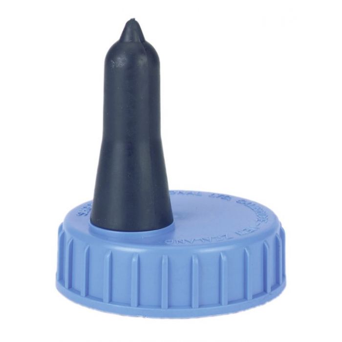 Speedy Feeder dop met speen. De kalverspeen is een pompspeen met 2 toevoeropeningen. De melk spuit bij het zuigen er in een V-vorm in de bek van het kalf, hierdoor worden desmaakpapillen gestimuleerd. De kalverspeen is laag in de schroefdop gemonteerd, zodat de fles geheel leeggedronken wordt.