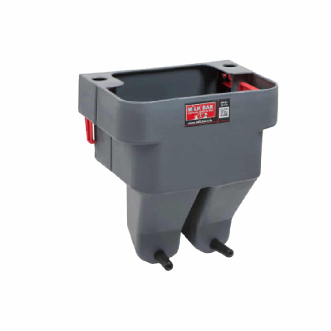 De Milk Bar kalverdrinkbar met 2 spenen. De Milkbar is geschikt voor 2 kalveren, ieder compartiment heeft een inhoud van 2,5 liter en de Milk Bar heeft een totale inhoud van 14 liter. Door de Milk Bar speen komt de melkstroom constant en langzaam, met veel speeksel. Door de drinkhouding en het krachtige zuigen stroomt de melk langs de pens naar de lebmaag. Het speeksel gaat gelijk mee. Dit houdt de PH stabiel, waardoor er geen verzuring optreedt. De combinatie van langzaam drinken en veel speeksel produceren heeft als voordeel dat de kalveren in groepen niet aan elkaar gaan sabbelen (navels, spenen of oren).