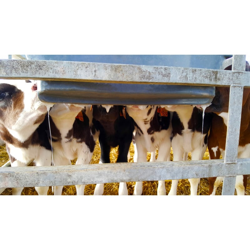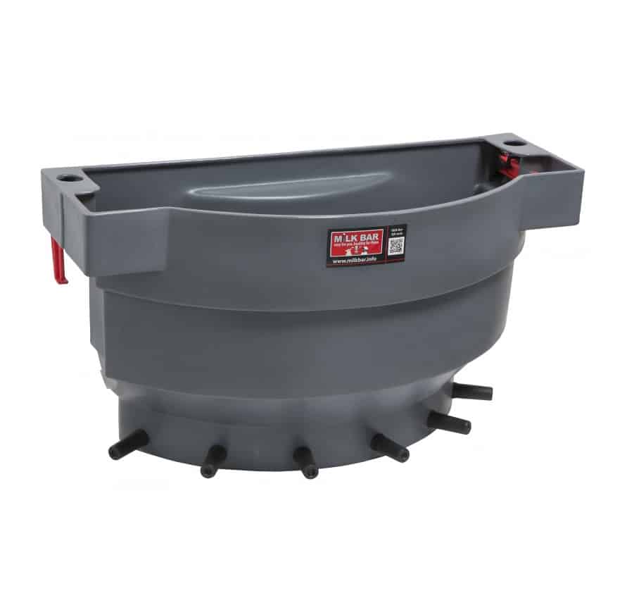 De Milk Bar kalverdrinkbar met 6 spenen. De Milkbar is geschikt voor 6 kalveren en heeft een inhoud van 36 liter. Door de Milk Bar speen komt de melkstroom constant en langzaam, met veel speeksel. Door de drinkhouding en het krachtige zuigen stroomt de melk langs de pens naar de lebmaag. Het speeksel gaat gelijk mee. Dit houdt de PH stabiel, waardoor er geen verzuring optreedt. De combinatie van langzaam drinken en veel speeksel produceren heeft als voordeel dat de kalveren in groepen niet aan elkaar gaan sabbelen (navels, spenen of oren).