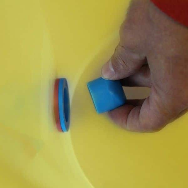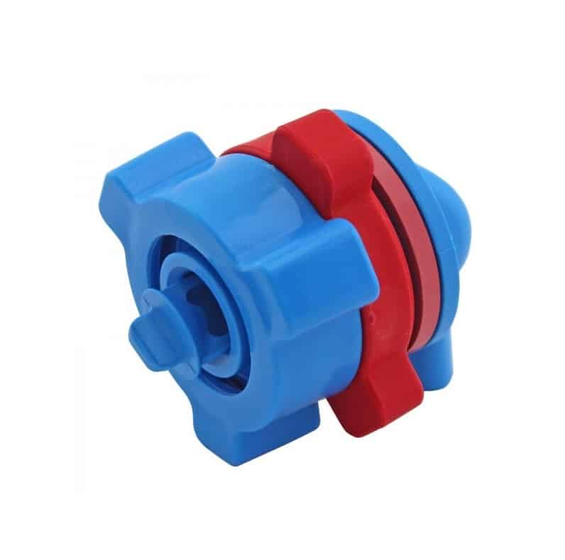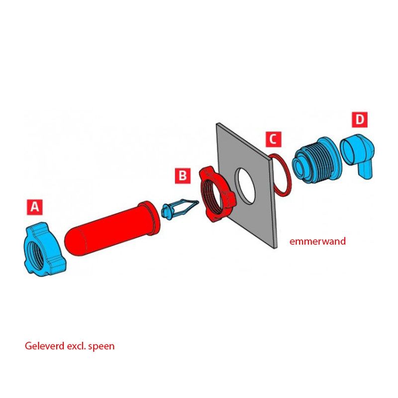 De nieuwe hygiëne koppeling voor kalverspenen van Gewa. De nieuwe kalverspeenkoppeling voor een snelle montage en eenvoudige reiniging. Voor een snelle reiniging hoeft alleen de voorste blauwe moer (A) te worden losgemaakt zodat het ventiel gedeelte (B) kan worden verwijderd. Verwijder het aanzuigstuk (D) in de drinkemmer en het ventiel kan eenvoudig worden gereinigd. en voorkomt dankzij de terugslagpen dat de melk terug in de emmer stroomt. De klep heeft een kantelbeveiliging en sluit betrouwbaar af met de meegeleverde rubberen afdichting (C). Het verlengde aanzuigstuk (D) zorgt ervoor dat er weinig melk in de drinkemmer achterblijft. De koppeling is geschikt voor alle GEWA kalver en lammer emmers en spenen.