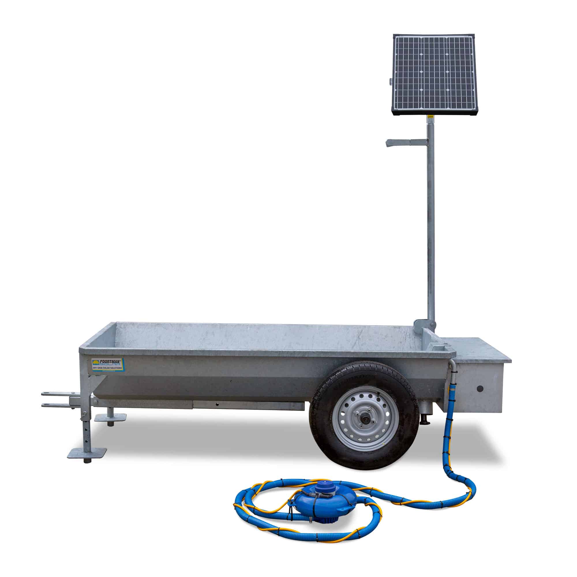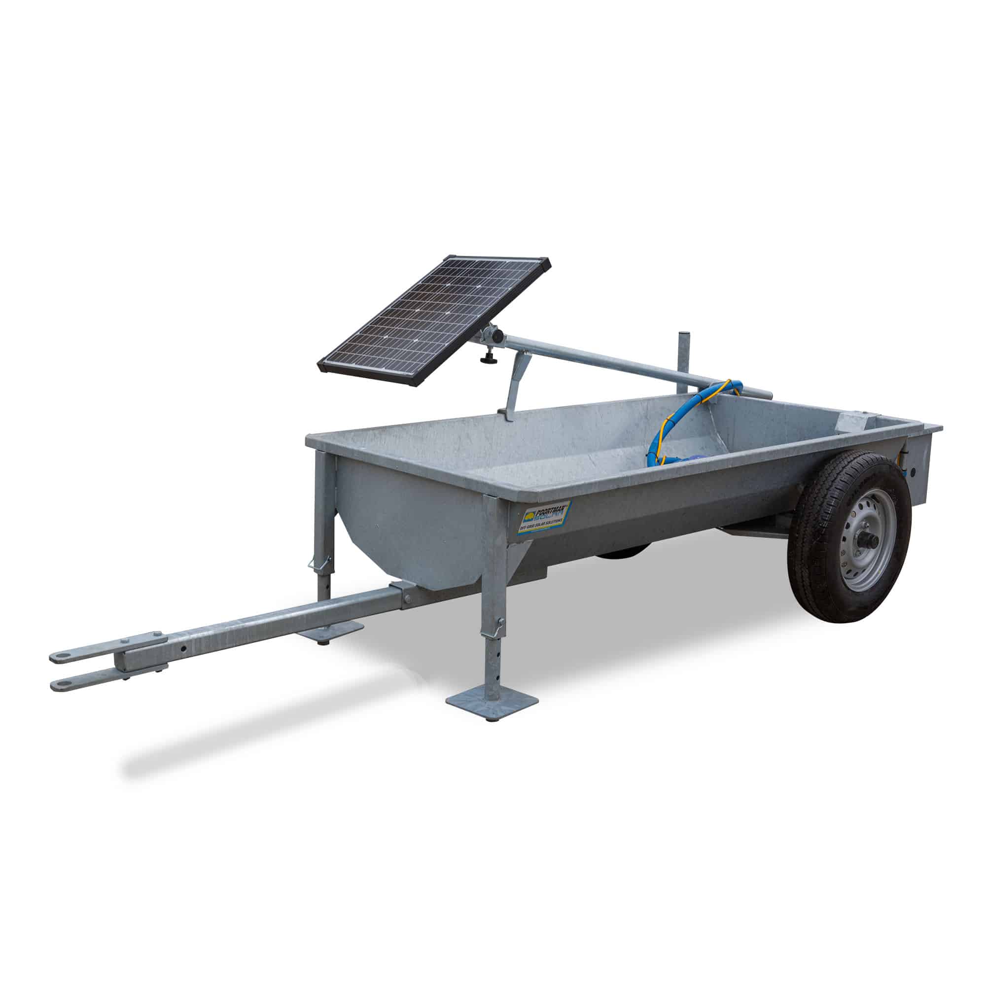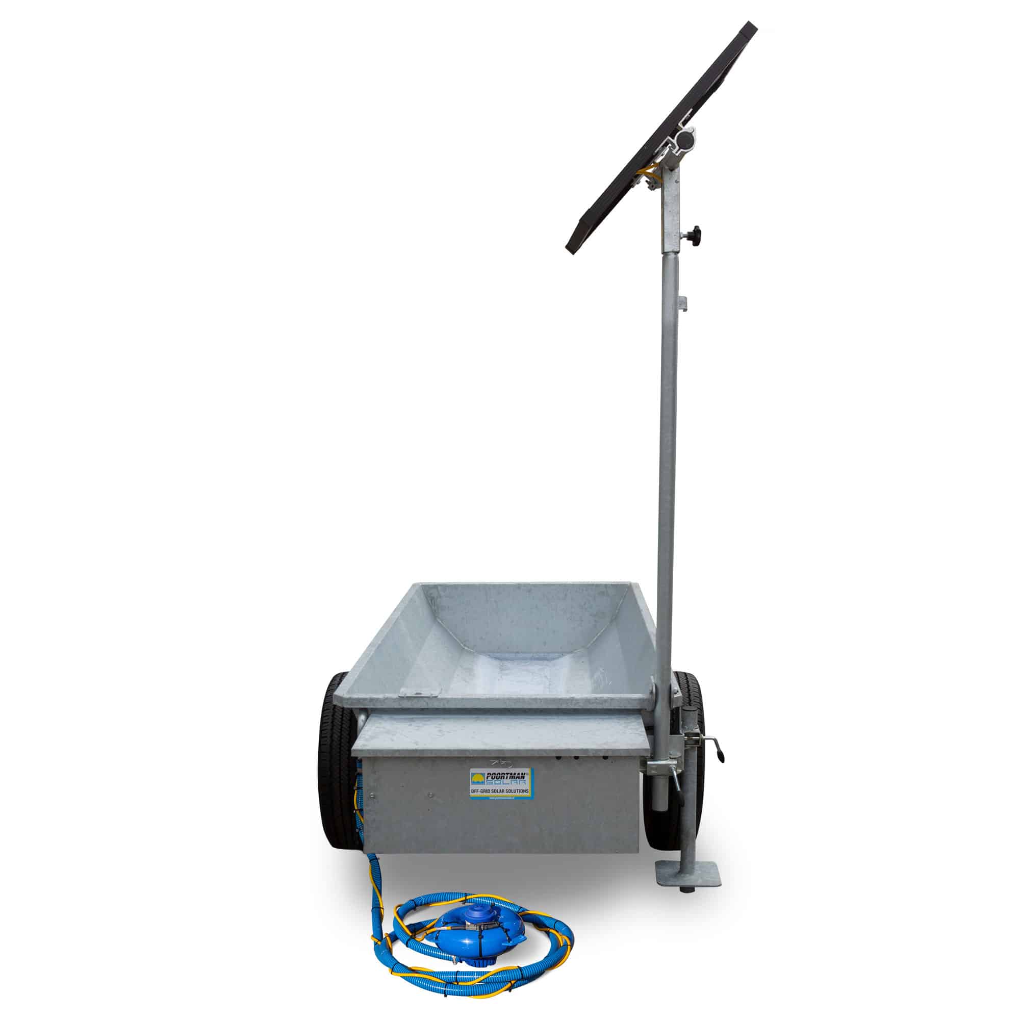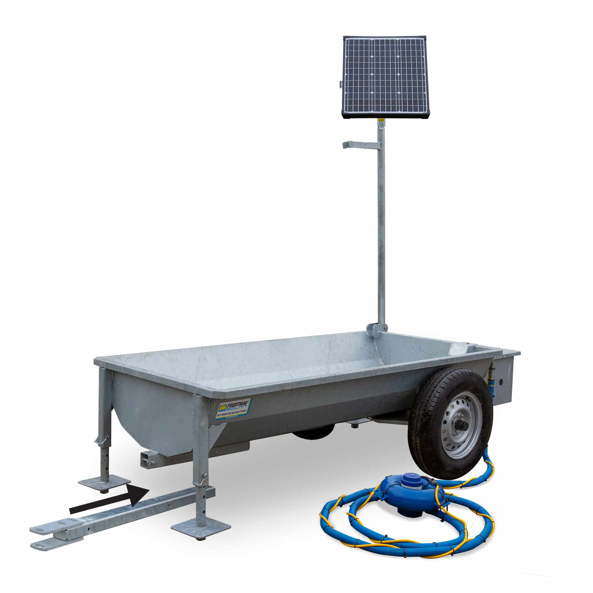 Mobiele weidedrinkbak op zonne-energie geschikt voor oppervlaktewater (slootwater). De verrijdbare Poortman drinkbak is door de 64cm drinkhoogte universeel inzetbaar voor zoogkoeien met kalveren, jongvee, paarden of kleine koppels melkvee. Het waterreservoir is snel leeg waarna de drinkunit eenvoudig verplaatst kan worden door de uitschuifbaar dissel en twee stevige wielen. De veedrinkunit is geheel gemaakt van dik gegalvaniseerd (plaat)staal, gegarandeerd een lange levensduur!