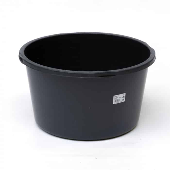 Zwarte ronde kunststof Gripline speciekuip, te gebruiken voor verschillende doeleinden. De bak is voorzien van vier ergonomische handgrepen, een stevige kruisbodem en een handige liter maatschaal. De speciekuipen zijn geschikt voor het bereiden van metselspecie of cement. Daarnaast worden de kuipen veel gebruikt als drinkbak voor schapen, paarden, kalveren of ander vee.