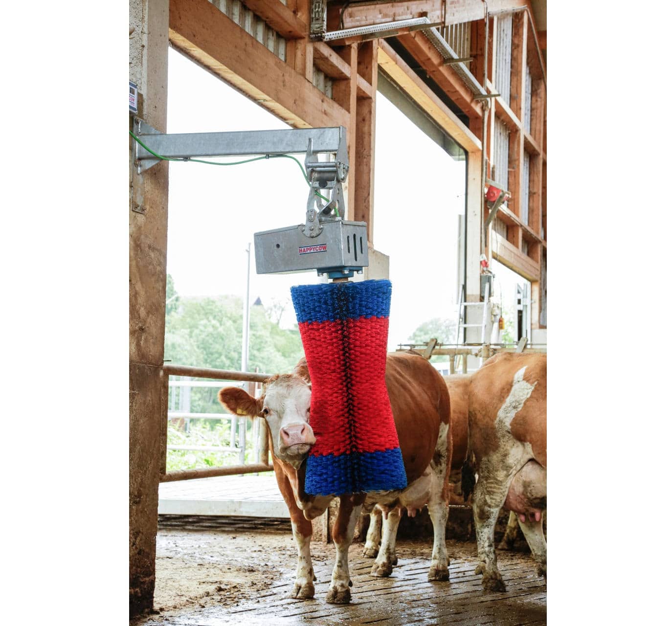 De roterende veeborstel HappyCow MaxiSwing draait in alle richtingen en onder vrijwel elke hoek, zodat elk deel van het lichaam (kop, romp) bereikt kan worden. De vorm van de borstels zorgt ervoor dat een groter oppervlak van de koe geborsteld wordt. De MaxiSwing koeborstel is niet alleen goed voor rust en comfort, maar zorgt ook voor meer hygiëne. Ingedroogde mest, huidschilfers en eventuele parasieten kunnen jeuk en irritatie veroorzaken. Koeien met jeuk en irritatie zijn onrustiger en brengen onrust in de koppel.