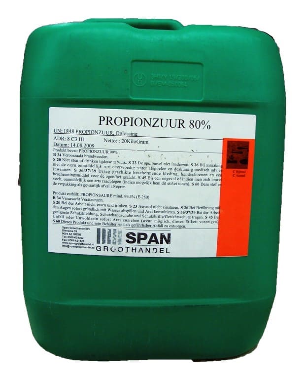 Propionzuur wordt o.a. gebruikt als inkuilmiddel om over het kuilvoer heen te spuiten/sproeien voordat dit afgedekt wordt, om het broeien tegen te houden.