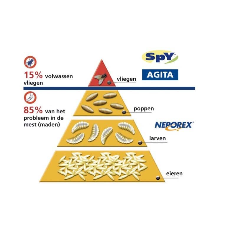 De natuurlijke vijanden (o.a. kevers, sluipwespen en mijten) blijven in leven en bestrijden dus, samen met de Neporex, de vliegenmaden. Zo wordt een nieuwe vliegenexplosie in de kiem gesmoord. Door de zeer goede oplosbaarheid van Neporex krijgt u een optimale indringing in de mest of voedselresten. Maden zijn niet in staat resistentie op te bouwen, hierdoor is er wereldwijd geen resistentie bekend. Volwassen vliegen worden niet bestreden.