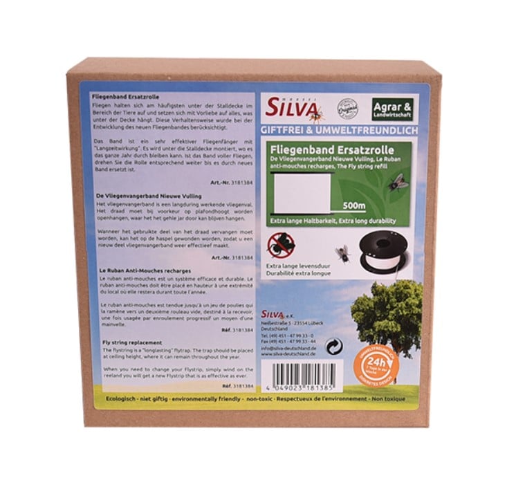 Silva vliegenlint, vervangingsrol met 500 meter kleeflint. Het vliegenlint is gifvrij en milieuvriendelijk en werkt uiterst effectief in stallen, schuren en in gesloten ruimtes. Eenmaal op het lint geland kunnen de vliegen er niet meer af. Hang het lint aan het plafond of tussen twee punten en begin direct met het vangen van vliegen. De rol past ook in vrijwel ieder verkrijgbaar katrolsysteem.