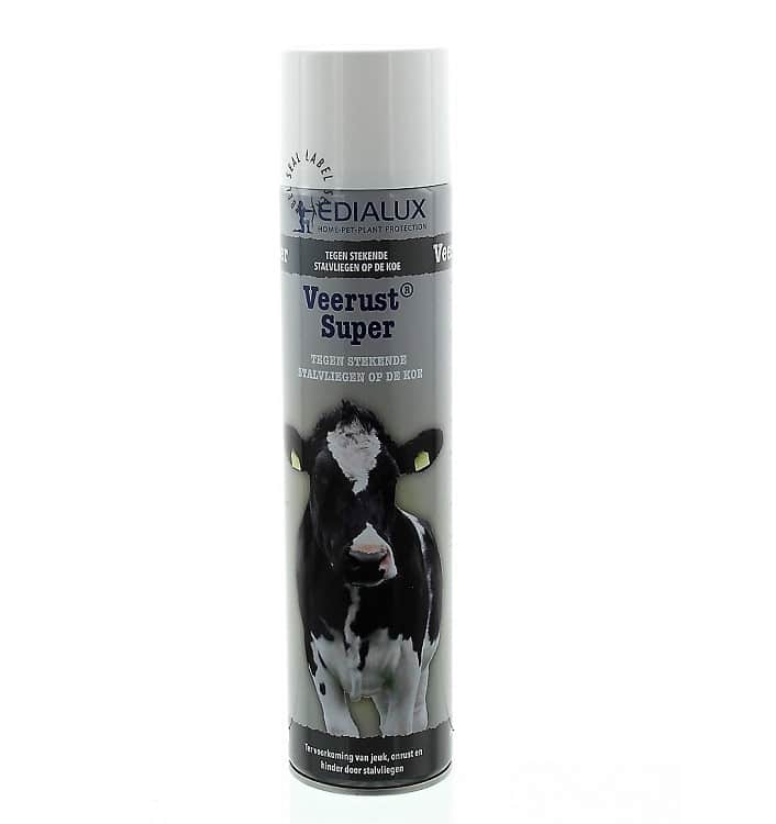 Veerust Super spray is speciaal ontwikkeld voor het bestrijden van vliegen op koeien. Veerust Super spray is een gebruiksklare huidspray voor runderen ter voorkoming van jeuk, onrust en hinder veroorzaakt door (stekende) vliegen. Het middel bestrijdt alle aanwezig vliegen en heeft een korte werkingsduur. Veerust Super Spray combineert een hoge effectiviteit met een zeer lage giftigheid voor dieren, hierdoor is het niet schadelijk voor het dier maar wel voor de vlieg. Veerust is geschikt voor koeien, pinken, kalveren en paarden. Onmisbaar bij goede vliegenbestrijding.