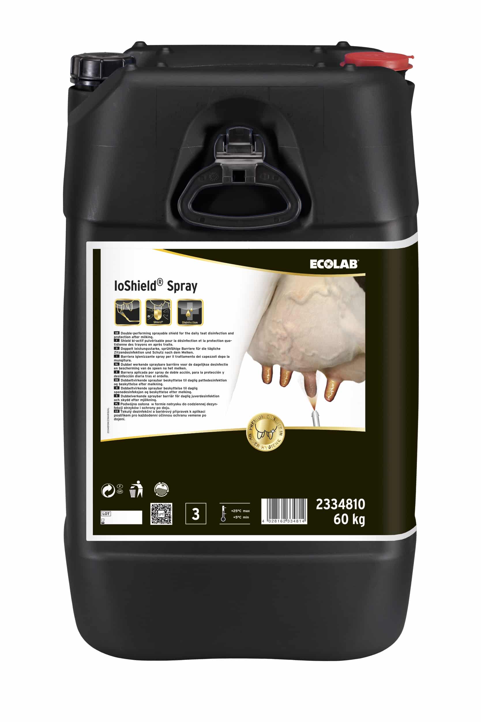 Ecolab Io-Shield Spray is een dubbel actieve spraybare barrière voor de dagelijkse bescherming en desinfectie van de spenen na het melken. Io-Shield Spray is een effectief barrièreproduct op basis van PVP jodium voor optimale uierdesinfectie en –bescherming tussen de melkbeurten. Het product droogt snel en vormt een unieke zichtbare en beschermende barrière tegen koegebonden- en omgevingsbacteriën. Dankzij de huidverzorgende componenten in Ecolab IoShield Spray blijft de speenhuid glad en soepel. De uierspray is gebruiksklaar en geschikt voor de spenen van melkkoeien, schapen en geiten. Het middel is gebruiksklaar en kan direct toegepast worden, voorkom dat de koeien gaan liggen totdat het product is gedroogd.