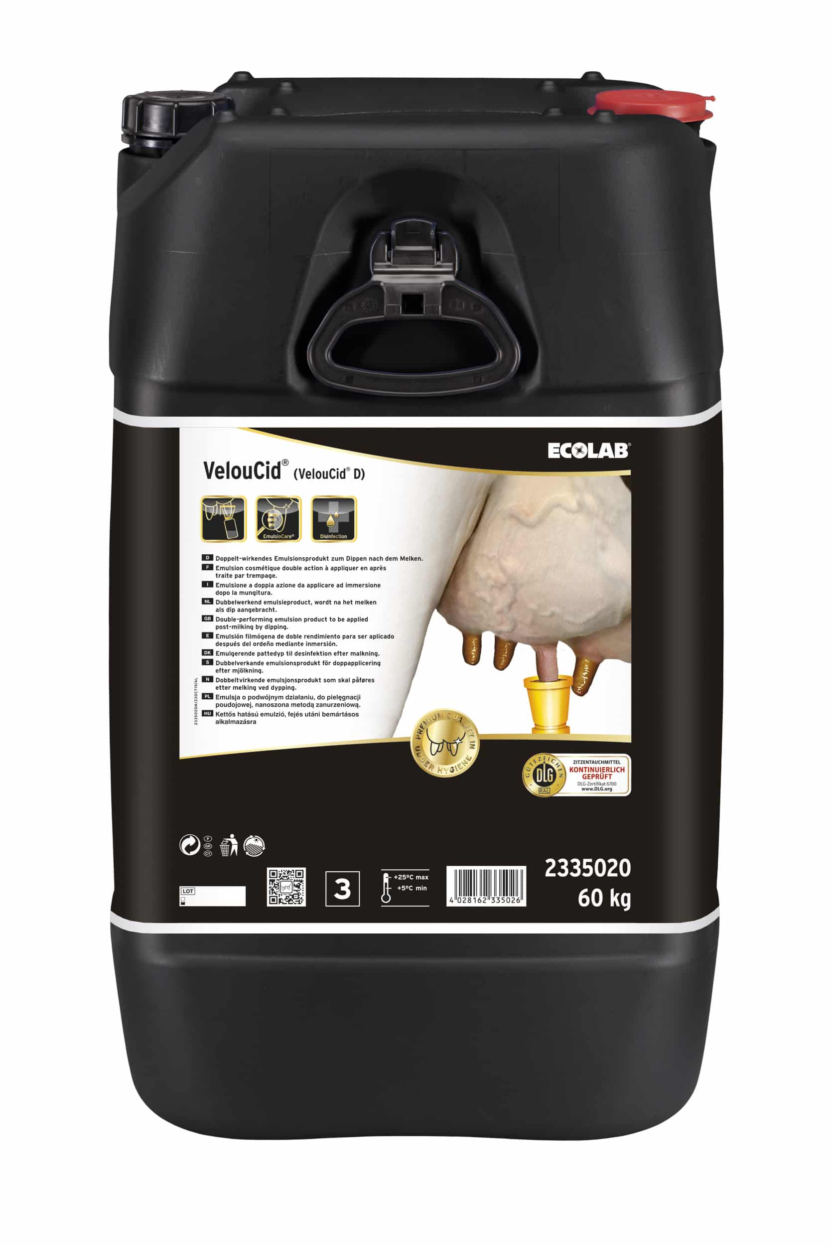Ecolab Veloucid dip P3 is een filmvormend dipmiddel voor de verzorging van de spenen na het melken. Veloucid is rijk aan huidverzorgende componenten en houdt daardoor de huid van de speen in uitstekende conditie. Uitstekend te gebruiken in koude en natte periodes. Voorkomt het kleven van vuil, hierdoor is het reinigen van de spenen voor het melken nog eenvoudiger.